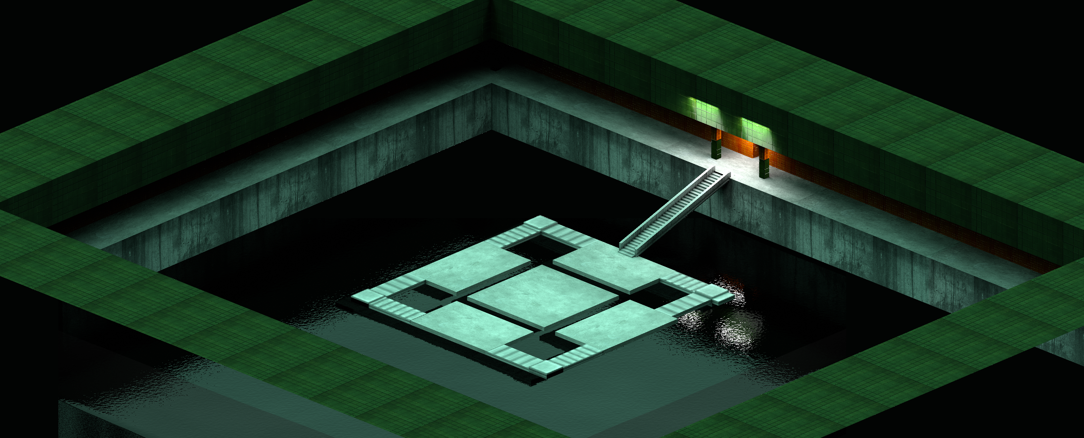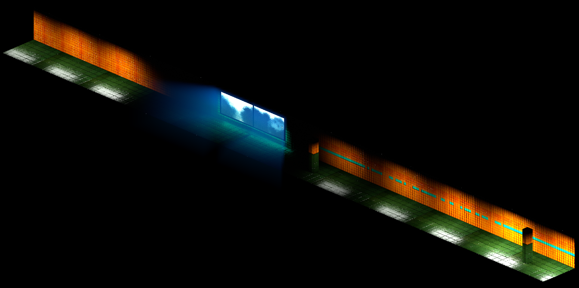 This final version adds multiple background layers (in-game, they're both independent and animated) and utilizes a colorful palette. The square background is reminiscent of a canceled project. The red ico sphere in the top right corner of the room originally transported you to other areas in the game. The ramp has been replaced with a semi-ring (it looks as if it were 1 sprite, in-game it is two, due to depth-sorting).